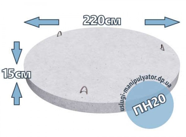Встановлення. При монтажі плити зазвичай укладаються на верхню частину залізобетонних кілець або інші елементи. З'єднання між плитою та кільцями часто виконується з використанням герметизуючих матеріалів (наприклад, гумових ущільнювачів або цементних розчинів), що дозволяє забезпечити додатковий захист від проникнення вологи та забруднень.
